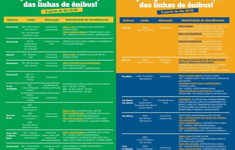 Alterações – As principais comunidades beneficiadas com a medida serão Alto do Peru, Fazenda Grande do Retiro, Capelinha, Bom Juá, Pau Miúdo, IAPI, Santa Mônica, Conjunto Marback, Stiep/Centro de Convenções, Vale do Matatu, Cabula, Pernambués, Saboeiro, São Gonçalo do Retiro, Nossa Senhora do Resgate, Conjunto ACM/Arraial do Retiro, Engomadeira, Arenoso, Tancredo Neves, Mata Escura/Jardim Santo Inácio, Sussuarana/Nova Sussuarana/Novo Horizonte.