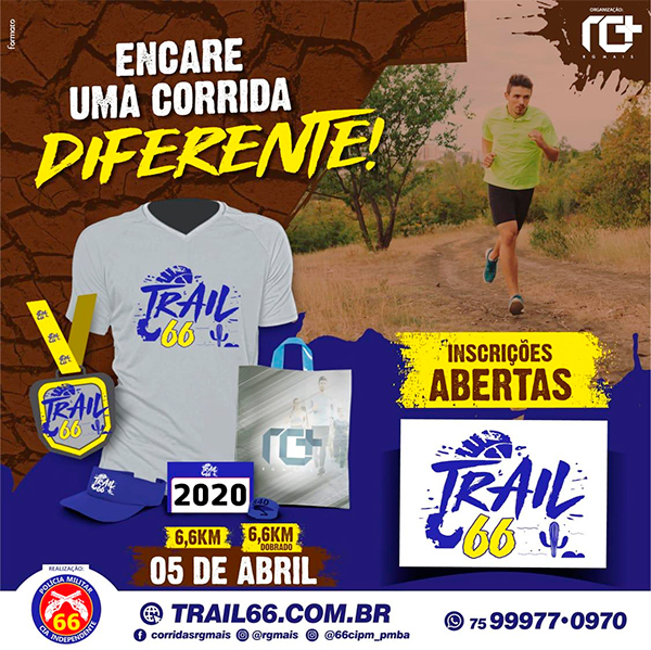 Estão abertas as inscrições para a primeira corrida da 66ª Companhia Independente da Polícia Militar (CIPM), nomeada de ‘Trail 66’, que acontecerá no dia 5 de abril, em Feira de Santana, com largada a partir das 7h, no bairro Sim, próximo ao Condomínio Dhama. Os percursos da prova serão de 6,6 Km ( (prova principal) equivalentes a 6.600 metros e 6,6 Km dobrado (prova geral) que equivalem a 13.200 metros. Os interessados em participar do desafio – que abrange trechos de asfalto, estrada de chão e trilha em ambiente rural -, podem se inscrever pelo endereço eletrônico (https://www.ticketagora.com.br/e/trail-66-29770).