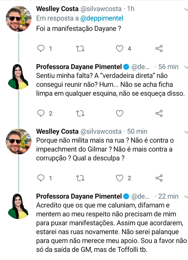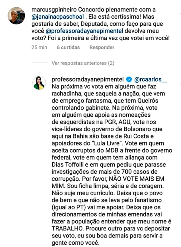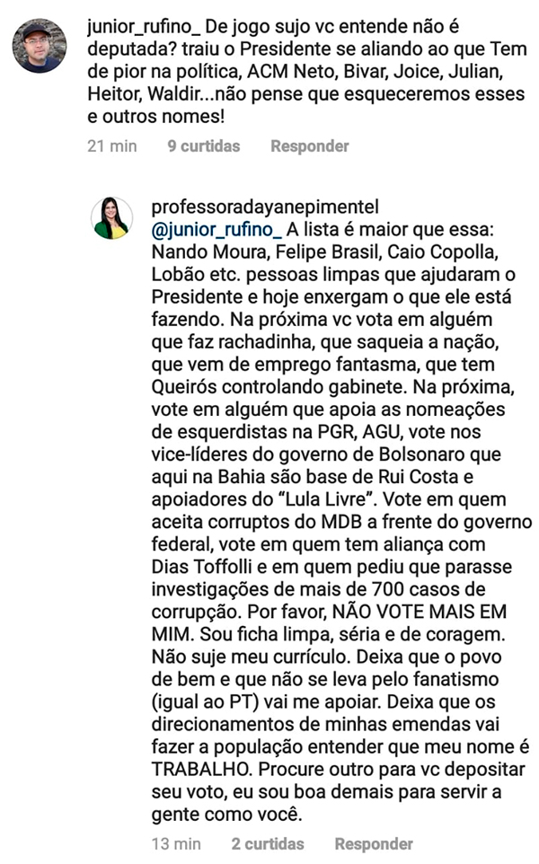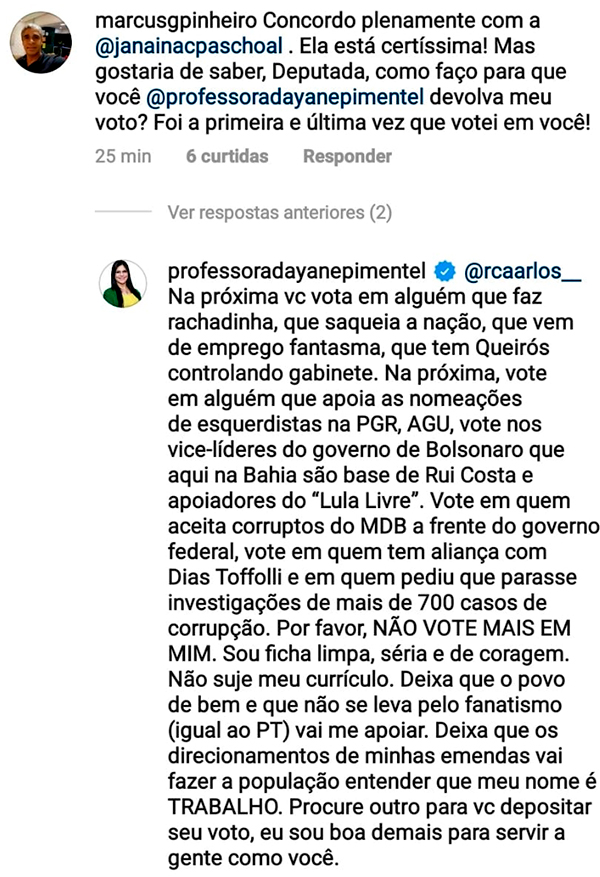 Mesmo depois de ter perdido mais de 15 mil seguidores em redes sociais, a deputada federal Dayane Pimentel não perde a oportunidade de insultar e denegrir eleitores que criticam o rompimento da parlamentar baiana com o presidente Jair Messias Bolsonaro.