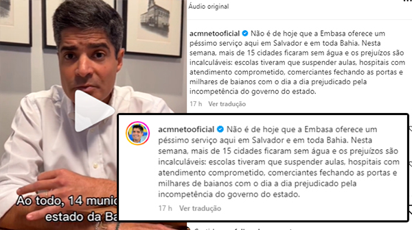 “O cidadão está sendo obrigado a cada vez pagar mais caro para ter a água com o serviço cada vez pior. Nos últimos anos, a gente só viu a Embasa trazer mais transtornos às pessoas. E o governo do estado, está fazendo o quê? Quais são as providências que o governador está tomando? Esse descaso da Embasa está afetando o dia a dia das pessoas. Trinta mil alunos sem aula hospitais sendo obrigados a paralisar os serviços. Comerciantes sendo diretamente afetados”.