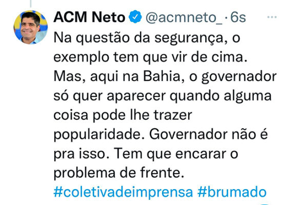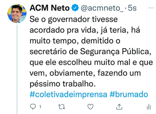 O pré-candidato a governador ACM Neto (União Brasil) disse nesta quinta-feira (19) que, após os últimos fatos recentes, o secretário da Segurança Pública do Estado, Ricardo Mandarino, deveria ser demitido. Ele voltou a criticar, em coletiva de imprensa em Brumado, os péssimos índices do Estado na área e defendeu mudança de postura do governador.