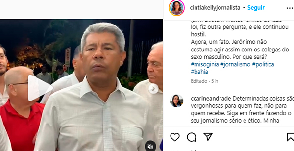 Em redes sociais, a jornalista Cintia Kelly desabafou sobre os ataques misóginos e machistas do governador Jerônimo Rodrigues.