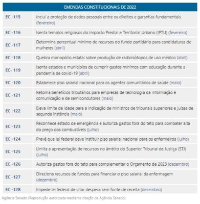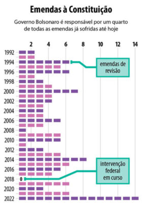 O Congresso Nacional promulgou 14 emendas à Constituição em 2022. O número é recorde para um único ano desde que a Carta entrou em vigor. O número de promulgações de 2022 é quase o dobro do ano recordista anterior — 2014, com oito emendas promulgadas. Além destes, em apenas cinco outros anos houve pelo menos seis promulgações, e dois deles também integram a legislatura atual (2019-2022). A única exceção é o ano de 2020, primeiro da pandemia de covid-19.