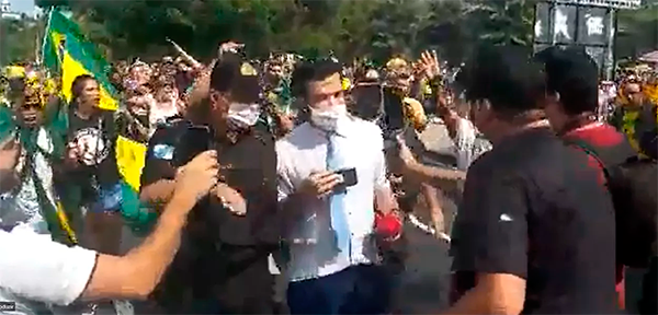 Imagens que circulam em redes sociais mostram um repórter da CNN sendo expulso da manifestação a favor do presidente Bolsonaro no Rio de Janeiro aos gritos de “lixo”.