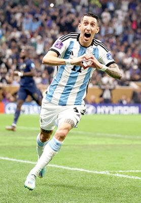 A superioridade argentina se consolidou a partir dos 20 minutos, novamente com Di Maria. O camisa 11 invadiu a área pela esquerda e foi derrubado pelo também atacante Ousmane Dembelé. Messi, de pênalti, deslocou Lloris e abriu o marcador. Aos 35, o meia Alexis Mac Allister puxou contra-ataque com Messi, que achou Júlian Álvarez pela direita. O atacante lançou Mac Allister, que entrou na área e rolou na esquerda para Di Maria, na saída do goleiro francês, ampliar a vantagem sul-americana e se emocionar na comemoração.