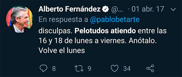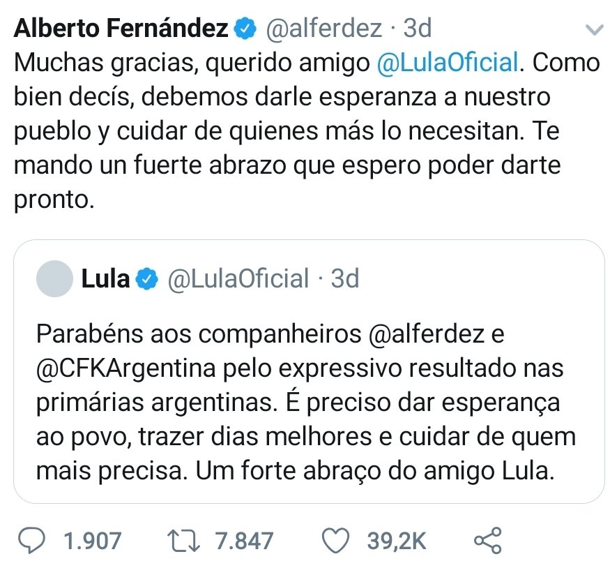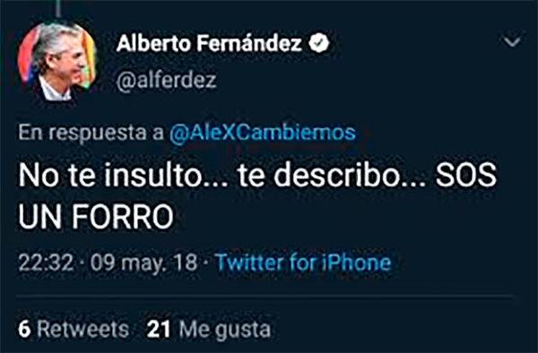 Tido por cientistas políticos argentinos como um “cavalo de troia para a venezualização” argentina, o candidato Alberto Fernandes destila todo seu ódio em redes sociais. Confira alguns prints do poste de Cristina Kirchner.