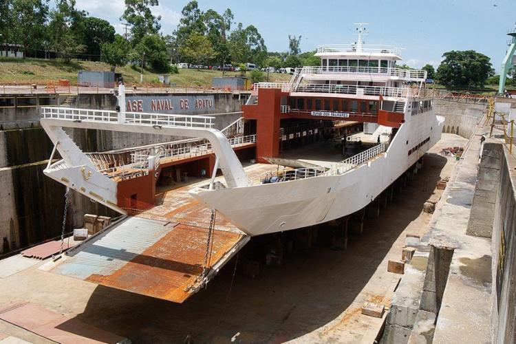A embarcação está ancorada no dique seco da Base Naval de Aratu (BNA) – local que permite que o ferry passe por intervenções sem a presença de água –, e os serviços são feitos por empresas de construção e reparação naval contratadas pela concessionária Internacional Travessias Salvador.