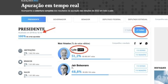 O portal de notícias O GLOBO publicou nesta quinta-feira (27) o resultado do pleito eleitoral 3 dias antes. Claro que, na publicação, o presidente eleito é o petista Lula da Silva. “Dolo” ou erro do estagiário. Prints: