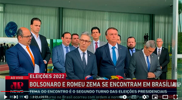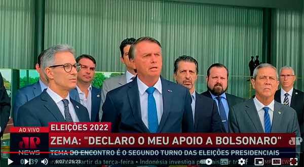 Governador de Minas Gerais, reeleito no primeiro turno das eleições deste ano, Romeu Zema (Novo) declarou apoio à candidatura do atual presidente Jair Bolsonaro (PL). O anúncio oficial do apoio ao presidente foi feito pelo governador na manhã desta terça-feira (04), quando Bolsonaro recebeu Zema em Brasília. Assista ao vídeo: …