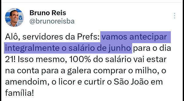 O prefeito Bruno Reis anunciou nesta quarta-feira (12) a antecipação de 100% dos salários dos servidores públicos municipais para o dia 21 de junho, antes portanto dos festejos de São João. O anúncio foi feito pelas redes sociais. “Alô, servidores da Prefs: vamos antecipar integralmente o salário de junho para …