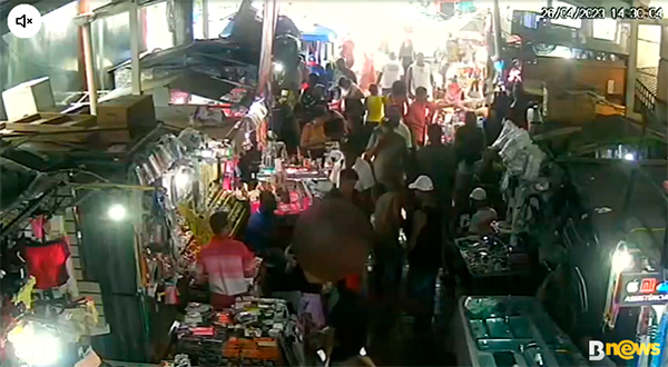 “Em outro vídeo, captado pela câmera de segurança por volta das 14h30, dois suspeitos fazem uma senhora de vítima. Um deles, que estava sem camisa, coloca a mão na bolsa da mulher, retira algo e sai andando com o parceiro.”