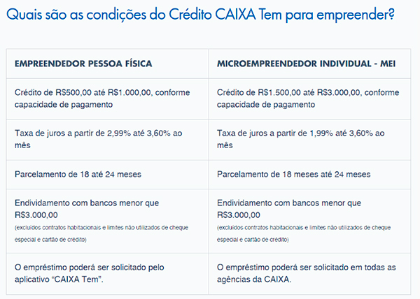 Linha de crédito da Caixa – A Caixa Econômica Federal oferece uma linha de crédito especial para o MEI de até R$ 3 mil, com parcelamento de 18 meses até 24 meses. O dinheiro pode ser utilizado na manutenção da empresa, pagamento de contas e fornecedores ou aquisição de insumos. A solicitação pode ser realizada por meio do aplicativo do Caixa Tem ou diretamente em uma das agências da Caixa.