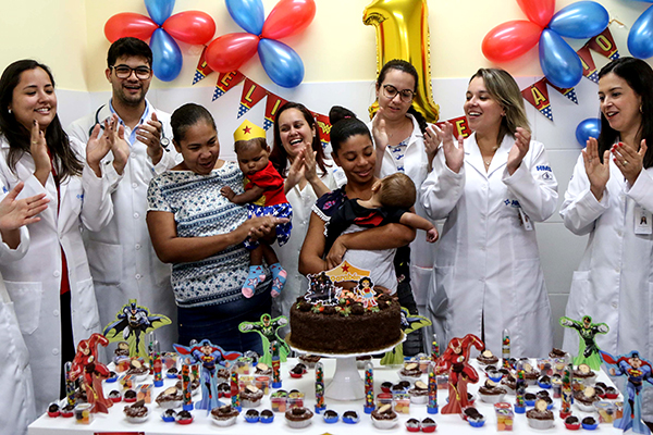 Vestidos de Superman e Mulher Maravilha, os heróis olhavam curiosos toda a gente que se uniu para comemorar a nova idade de ambos. “Agora Lorena tem duas datas de nascimento: o dia 10 de janeiro, dia em que ela entrou aqui, e 1º de abril”, disse Elizu, emocionada. Ela, cozinheira por profissão e moradora da cidade de Porto Seguro, agradeceu pelo atendimento. “Foi ótimo. Todo mundo aqui trabalha com amor e carinho. A equipe médica, os profissionais de limpeza, o porteiro, os enfermeiros. O atendimento é diferente, nem mesmo os hospitais particulares da minha cidade têm um atendimento desse”.