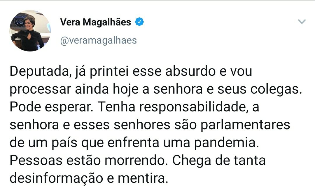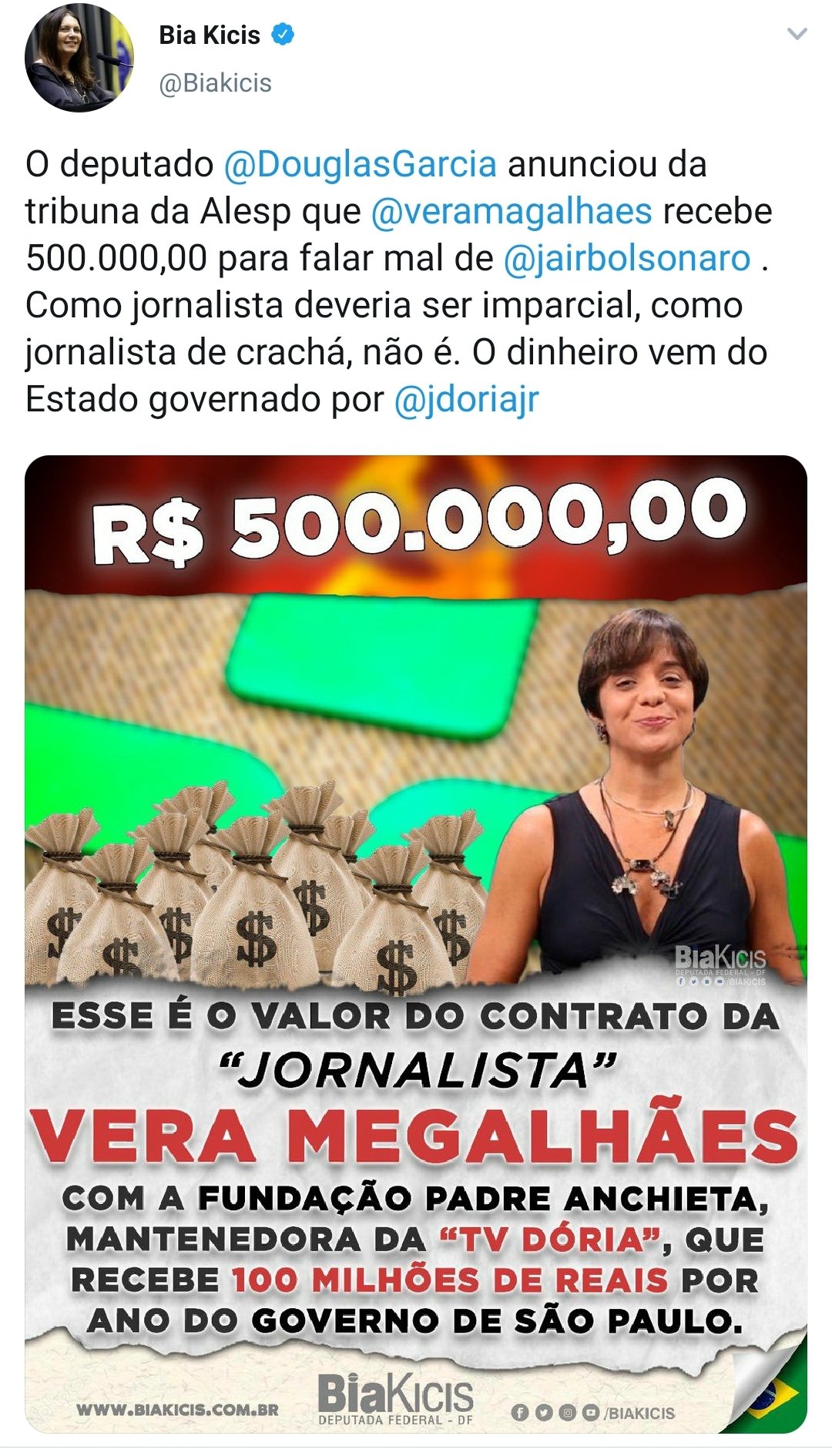 Segundo a deputada Bia Kicis, a jornalista Vera Magalhães teria recebido meio milhão de reais via Fundação Pedro Anchieta (TV Cultura). “O dinheiro vem do Estado governado por João Dória”, denuncia a parlamentar. A jornalista ameaçou: “vou processar ainda hoje”.