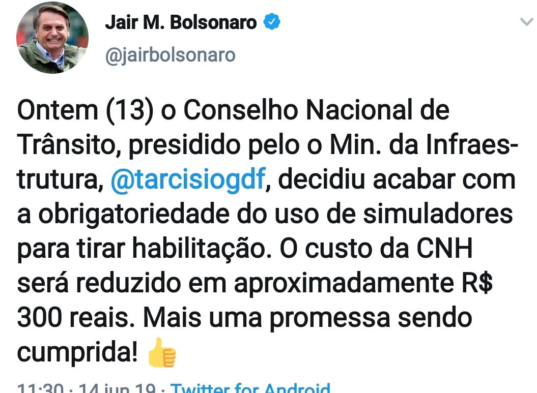 Mudança defendida pelo presidente Jair Bolsonaro começa a valer em 90 dias a partir de uma determinação do Conselho Nacional de Trânsito (Contran) que decidiu que o uso de simuladores na formação de motoristas não será mais obrigatório. Confira no print.