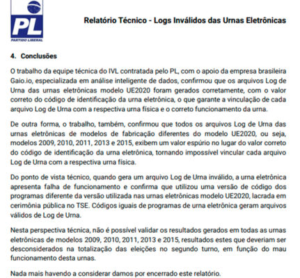“Do ponto de vista técnico, quando gera um arquivo de Log de Urna inválido, a urna eletrônica apresenta falha de funcionamento e confirma que utilizou uma versão de código dos programas diferente da versão utilizada nas urnas eletrônicas modelo UE2020, lacrada em cerimônia pública no TSE. Códigos iguais de programas de urna eletrônicas geral arquivos válidos de Log de Urna.”