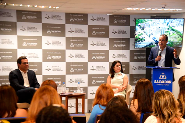 A Prefeitura de Salvador inaugurou nesta segunda-feira (11) o Centro de Formação Emília Ferreiro, um inédito equipamento na capital baiana que será dedicado à capacitação dos educadores e outros profissionais que atuam na Rede Municipal de Educação. O evento reuniu centenas de professores, coordenadores pedagógicos e outros servidores no prédio, localizado no Costa Azul. Eles puderam conhecer a grande estrutura ao lado do prefeito Bruno Reis e do secretário de Educação (Smed), Thiago Dantas.