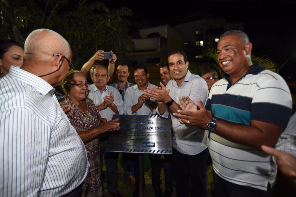 “A construção e requalificação de praças estimulam o convívio, resgatam a autoestima dos moradores das comunidades e contribuem para melhorar a qualidade de vida da população”, afirmou o vice-prefeito Bruno Reis, ao lado do vereador Alfredo Mangueira, na inauguração da Praça Capitão Nelson, na Rua Vicentina, no Queimadinho, na noite de terça-feira (5).