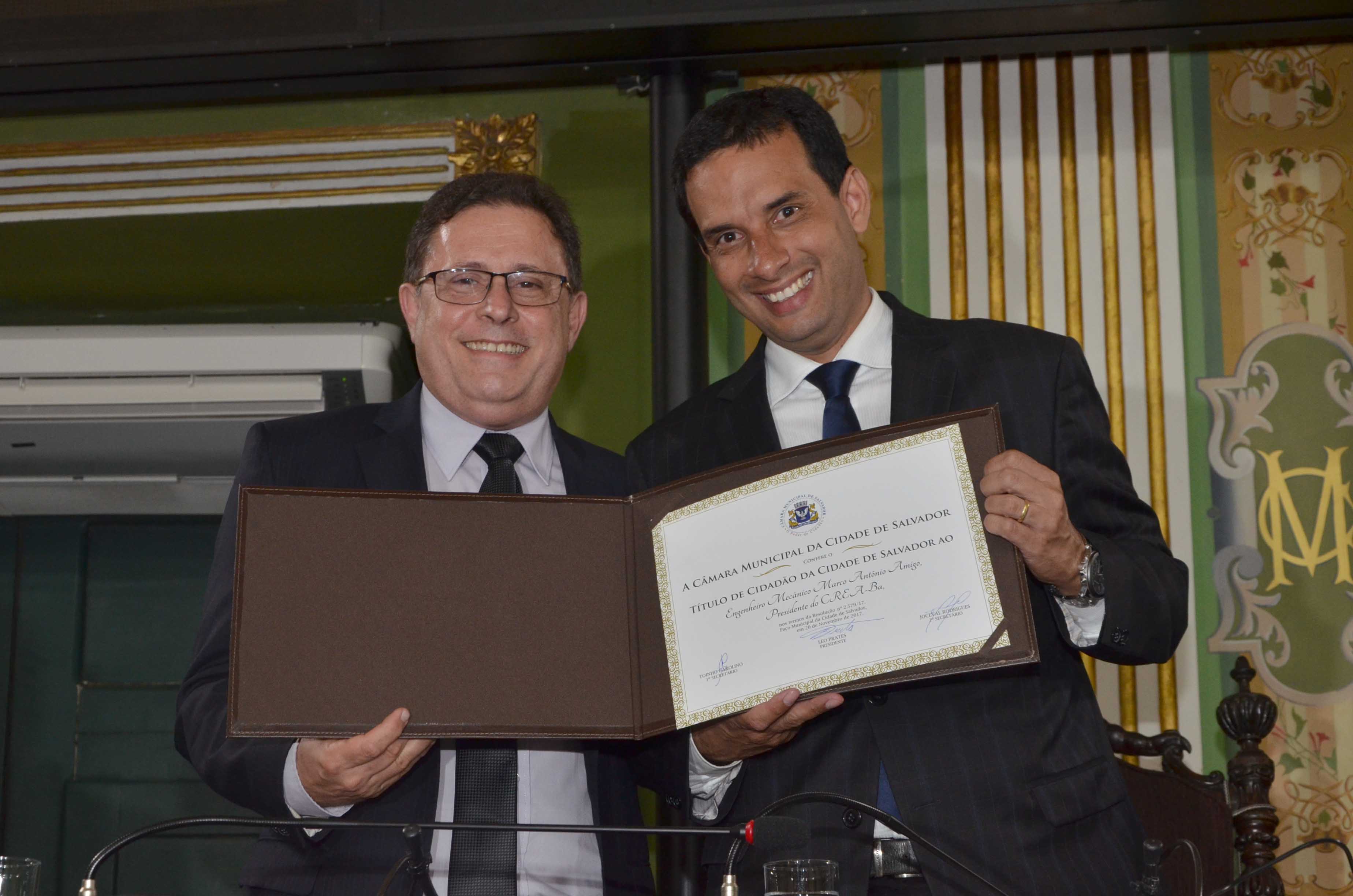 Presidente do Conselho Regional de Engenharia e Agronomia da Bahia (Crea) por quatro mandatos, o carioca Marco Antonio Amigo agora é também cidadão de Salvador. O título foi entregue na noite desta segunda-feira (20) pelo vereador Leo Prates (DEM), presidente da Câmara Municipal, em sessão solene no Plenário Cosme de Farias. Ao justificar a honraria, Prates, que é engenheiro, frisou que o homenageado marcou suas gestões à frente do sistema Confeas/Crea com grandes realizações e avanços para a classe.