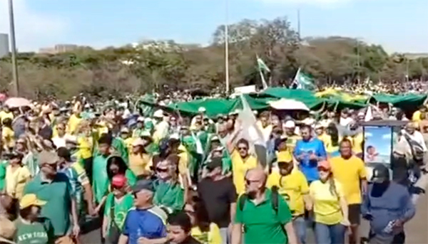 A “Caminhada pela Liberdade”, convocada pelas parlamentares Bia Kicis e Damares Alves, começou por volta das 10h, em frente ao Banco Central, e percorreu cerca de 1 km. O grupo marcou presença com camisas verde e amarelo, faixas em inglês e bandeiras do Brasil, EUA, Israel e até do Império. Eles gritavam frases como “presidente Trump, contamos com você”, “fora Moraes”, “Moraes ditador”, “a culpa é do Lula” e “anistia já”, exigindo perdão para os acusados do episódio de 8 de janeiro, incluindo Bolsonaro.