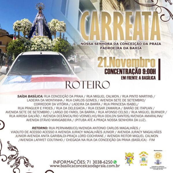 Na sequência será realizado o hasteamento das bandeiras de Salvador, do Estado e do Vaticano para, logo após, iniciar a carreata com a imagem de Nossa Senhora da Conceição da Praia, que sairá das escadarias da Basílica e passará pelo Comércio, Avenida Carlos Gomes, Corredor da Vitória, Barra, Ondina, Rio Vermelho, Amaralina, Pituba (Praça Nossa Senhora da Luz), retornando para a Basílica.