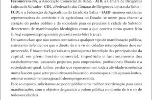 Em nota, FECOMERCIO, ADL e FAEB repudiam os “prejuízos à cidade de Salvador, decorrentes de manifestações ideológicas”. Confira no card abaixo.