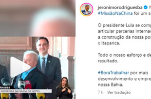 Em redes sociais, o “governador” Jerônimo Rodrigues publicou um vídeo onde o descondenado Lula da Silva, do PT, afirmou que o baiano “foi o grande premiado na viagem aos Emiratos Árabes”. “Assumi o compromisso com ele de que a estrada (sic) que liga Salvador a Itaparica uma ponte de 13 …