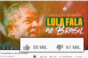 As críticas do corrupto e lavador de dinheiro Lula da Silva do PT contra o presidente Jair Messias Bolsonaro motivou uma chuva de protestas e “dislikes” em youtube, chegando a ultrapassar a quantidade de compartilhamentos e likes. Link > https://www.youtube.com/watch?v=1H9KuXvxpP4