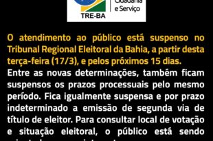 O atendimento ao público está suspenso no Tribunal Regional Eleitoral da Bahia a partir desta terça-feira (17/3) e pelos próximos 15 dias. A determinação altera a Portaria nº 104, publicada pelo presidente do TRE-BA, desembargador Jatahy Junior com o objetivo de conter o avanço do Coronavírus no estado. Entre as novas …