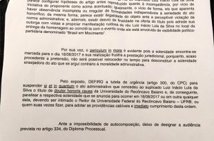 A caravana do ex-presidente Luiz Inácio Lula da Silva pelo Nordeste nem começou e já tem a primeira pedra no caminho do petista. A Justiça Federal deferiu a liminar cancelando a entrega do título de doutor honoris causa ao ex-presidente concedido pela Universidade Federal do Recôncavo Baiano (UFRB), criada na …