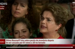 Em coletiva de imprensa, Dilma Rousseff comenta perda do mandato depois de ter sido cassada no Senado. “Rasgaram a Constituição. Condenaram uma inocente e consumaram um golpe parlamentar. Apropriam-se do poder por meio de golpe de Estado. É o segundo golpe que enfrento na vida. Uma farsa jurídica me derruba …