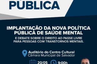 A implantação da nova política de saúde mental e direito ao Passe Livre para pessoas com transtornos mentais será tema de debate na próxima segunda-feira (20), às 9h, no Centro de Cultura da Câmara Municipal de Salvador. “Os Centros de Atenção Psicossocial (CAPS) precisam de reforço multidisciplinar e equipamentos e …