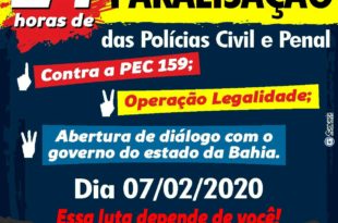 Divulgação Os policiais civis da Bahia irão parar suas atividades por 24h a partir das 8h desta sexta-feira (7). De acordo com o Sindicato dos Policiais Civis da Bahia (Sindpoc), o ato é realizado para reivindicar a aprovação da reforma da previdência – PEC 159 e a falta de diálogo …