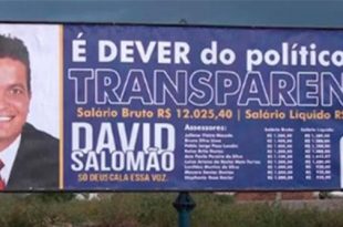 Um vereador de Vitória da Conquista, no sudoeste da Bahia, espalhou outdoors pela cidade para divulgar o valor do salário que recebe e o e de seus assessores para mostrar a transparência em termos de remuneração que, conforme ele mesmo defende, que é dever de todo político”. David Salomão tem …