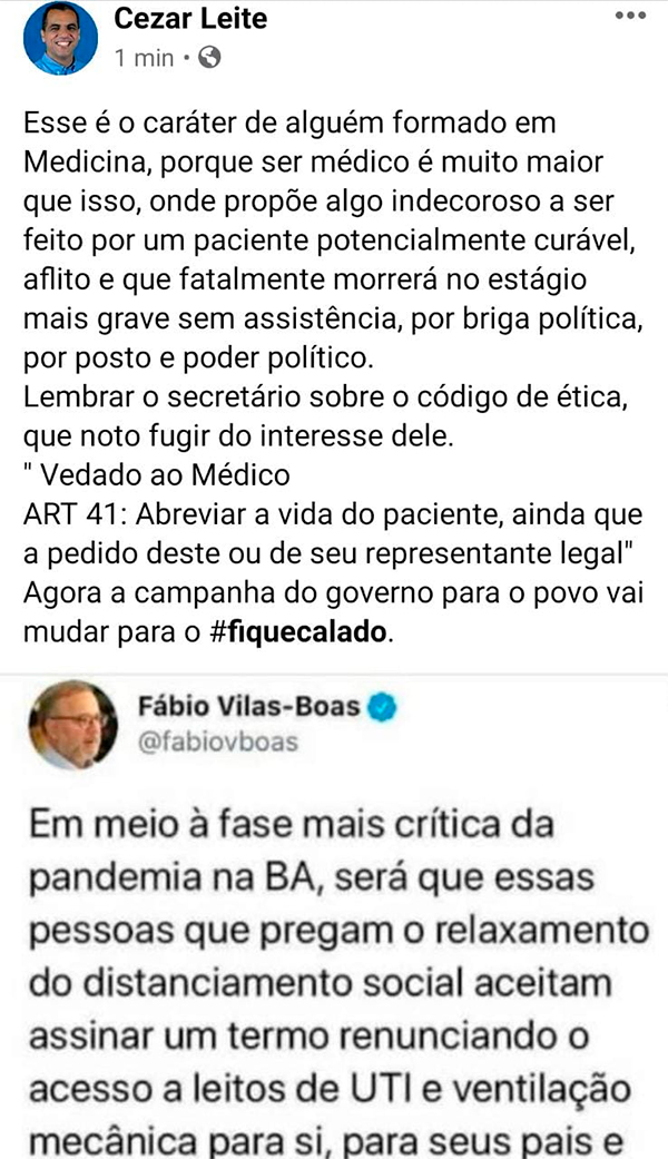Vereador e pré-candidato a prefeito de Salvador pelo PRTB, Cezar Leite questionou o caráter do tenista, e secretário de saúde nas horas vagas, Fábio Vilas Boas. “O critério de indicação de Unidade de Terapia Intensiva – UTI para casos graves de vírus chinês segundo Fábio Vilas Boas é ser submisso ao Governo do Estado. Agora além do ‘Fique em Casa’ temos o ‘Fique Calado’”, disse.