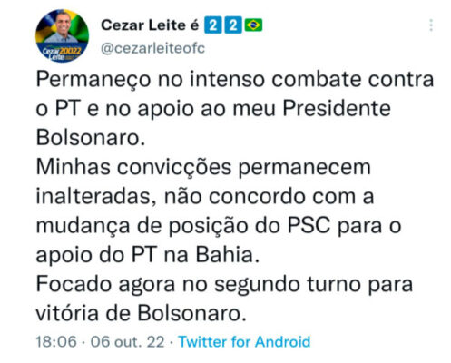 Em redes sociais, Cezar Leite comentou o que a Bahia está careca de saber: a luta é contra a petezada.