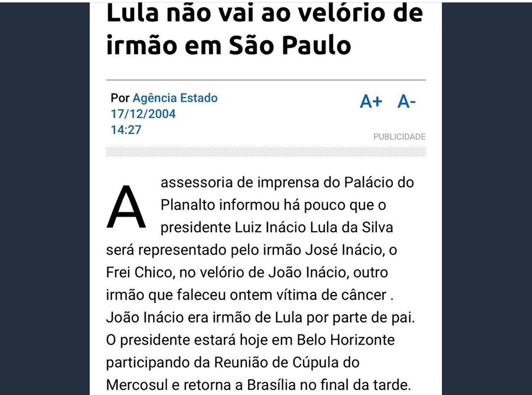 A Polícia Federal frustrou mais um plano do presidiário petista Lula de transformar o enterro de seu irmão, o Vavá, em um evento partidário para atacar a Lava Jato, a Polícia Federal e o ministro da Justiça, Sérgio Moro… além, claro, de uma possível fuga. Em dezembro de 2004 e janeiro de 2005, Lula faltou ao velório dos irmãos Silva Neto e Odair. O então presidente enviou como representante seu outro irmão, Frei Chico. O petista estava livre em outros velórios e mandou representante, agora que sair da cadeia?