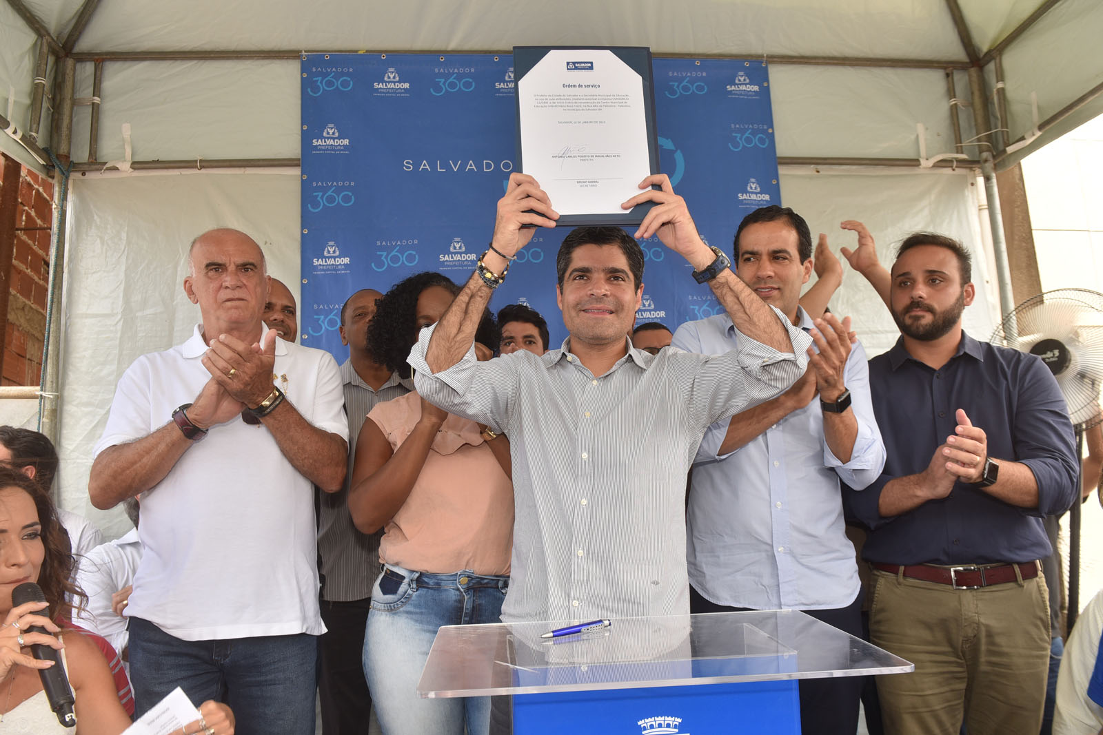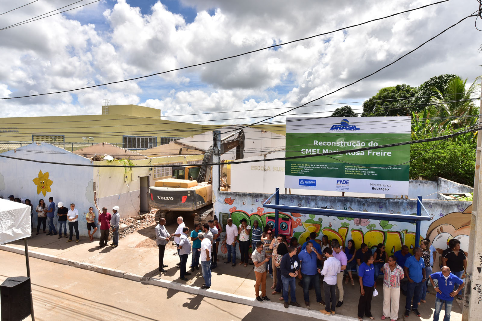 Ao som e beleza da Fanfarra Municipal da Palestina (Famup), um misto de saudosismo e expectativa era eminente nos moradores do bairro, que fica no limite com o município de Simões Filho. Isso porque o Centro Municipal de Educação Infantil (CMEI) Maria Rosa Freire, situada ao lado da Escola Municipal da Palestina, teve a demolição da antiga estrutura iniciada nesta quarta-feira (16). No local, a ordem de serviço para o início das obras de reconstrução foi assinada pelo prefeito ACM Neto, acompanhado do vice, Bruno Reis; do secretário municipal da Educação (Smed), Bruno Barral, demais gestores e comunidade escolar.