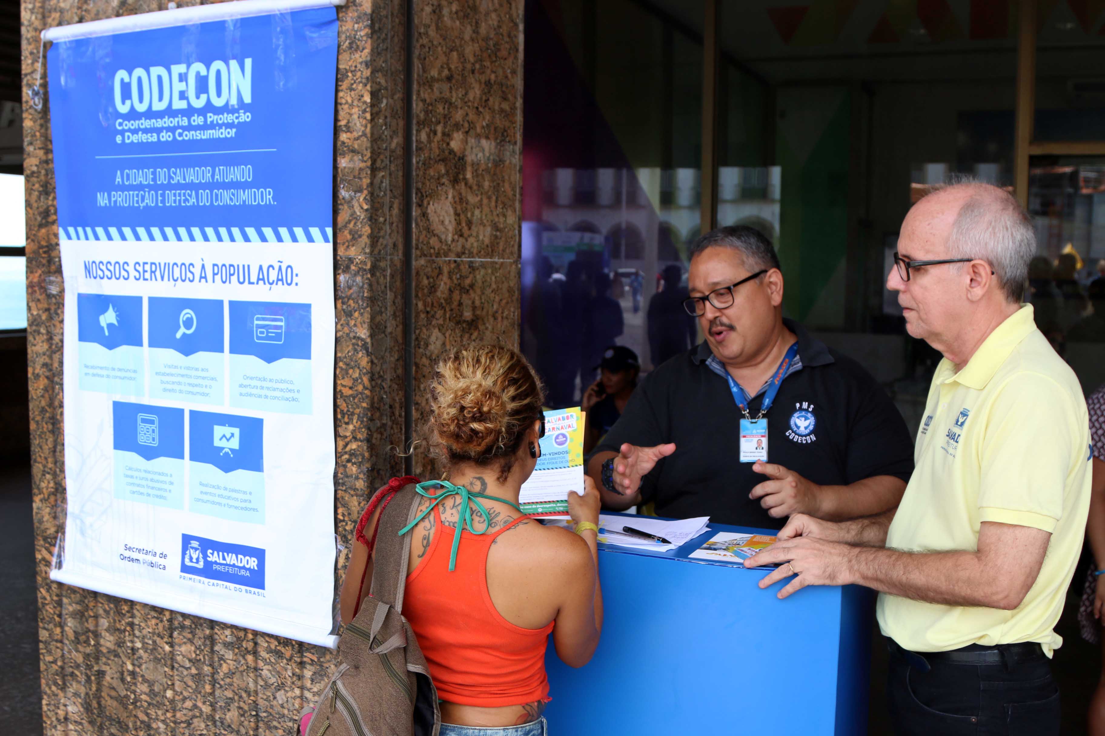 Com o objetivo de fiscalizar o cumprimento das leis dos consumidores, orientar sobre o condicionamento, validade dos alimentos e bebidas durante o Carnaval, a Diretoria de Ações de Proteção e Defesa do Consumidor (Codecon), órgão vinculado à Secretaria Municipal de Ordem Pública (Semop), montou um balcão de informações em frente ao Elevador Lacerda e atuará de forma intensa nos dias da festa.
