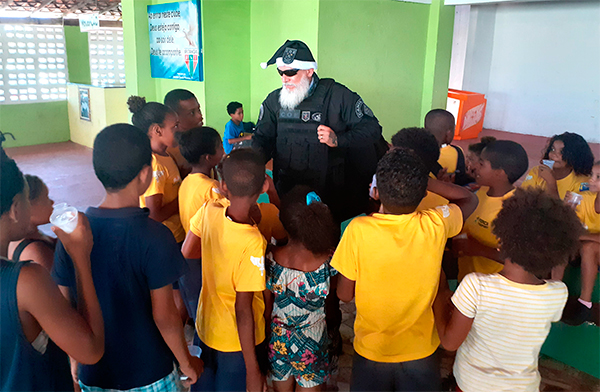 Para alunos do Programa Forças no Esporte, da Base Aérea de Salvador, e 30 crianças assistidas pela instituição social Aldeias Infantis SOS Brasil o Natal começou mais cedo, com a entrega de presentes, realizada na manhã desta terça-feira (17), por uma equipe da Coordenação de Operações Especiais (COE), da Polícia Civil. A ação, que está na segunda edição, ocorreu na Associação Atlética Ipitanga e na sede da SOS Brasil, respectivamente, localizadas no centro de Lauro de Freitas. Além de brinquedos, os policiais distribuíram também doces, pizzas e picolés para a criançada. “Bacana esse trabalho de inclusão com as crianças, que melhora a relação da polícia com a comunidade”, destacou o cabo Gilson Silva, da Base Aérea, que também é professor de canto do Projeto.