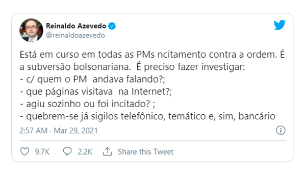 Em redes sociais, o jornalista e colunista político, Reinaldo Azevedo alertou para o que deve ser um motim nacional dos policiais militares contra decretos e determinações de governadores.