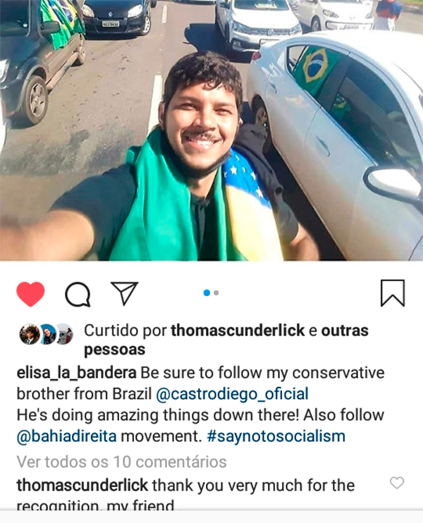 A empresária e vice-presidente da Assembleia Nacional Hispânica do Partido Republicano, Elisa Slider, enalteceu em suas redes sociais o trabalho do líder conservador baiano Diego Castro. Castro é um dos coordenadores do Movimento Bahia Direita e Presidente fundador da Organização Latinoamerica Unidad. Ele também tem uma forte atuação internacional na politica continental das Américas, onde já foi alvo de elogios figuras politicas latinas, em destaque, o vice-presidente de Honduras, Ricardo Álvarez e do Presidente do Chile, Sebastian Piñera. Em sua rede social, Elisa apontou que Diego “esta fazendo grandes coisas no sul”.