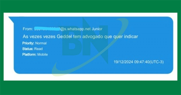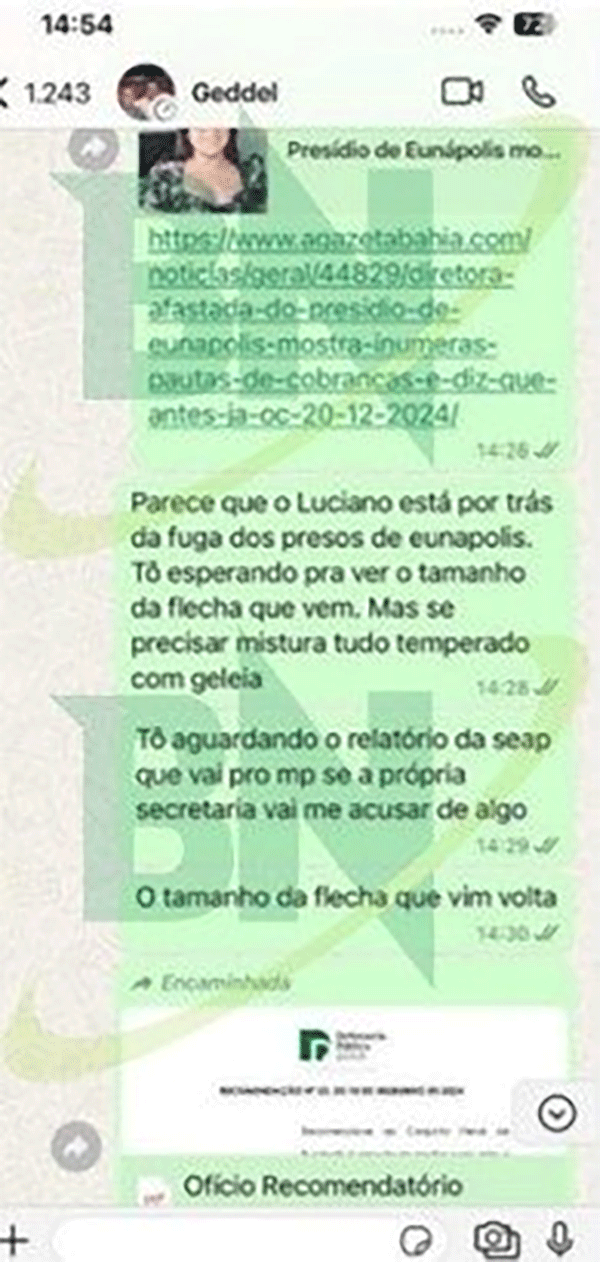 O escândalo cresceu ainda mais quando o nome do ex-presidiário Geddel Vieira Lima apareceu na delação da ex-diretora Joneuma Silva Neres como possível beneficiário de parte da propina… cerca de R$ 1 milhão. E não ficou só na fala: o Bahia Notícias publicou mensagens de WhatsApp atribuídas a Uldurico, Joneuma e Geddel, com trechos de forte tensão.