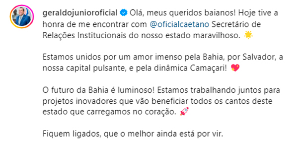 Em uma foto publicada em redes sociais, Geraldo Júnior apareceu de mãos dadas com o secretário de Relações Institucionais, Luiz Caetano. O registro, compartilhado nas redes sociais, veio acompanhado de uma legenda sugestiva: “Estamos unidos por um amor imenso pela Bahia e por Salvador. E também por Camaçari, uma cidade tão dinâmica!”