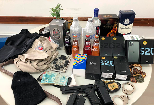 Também foram apreendidos, um simulacro de arma de fogo, máquina de eletrochoque, algemas, touca tipo balaclava, uma câmera, whiskys, uma quantia em dinheiro, caderno de anotações, além de uniformes semelhantes aos das policias Civil e Militar. O DCCP segue com as investigações, com o objetivo de identificar e prender outros envolvidos e a origem dos uniformes utilizados pelos assaltantes.