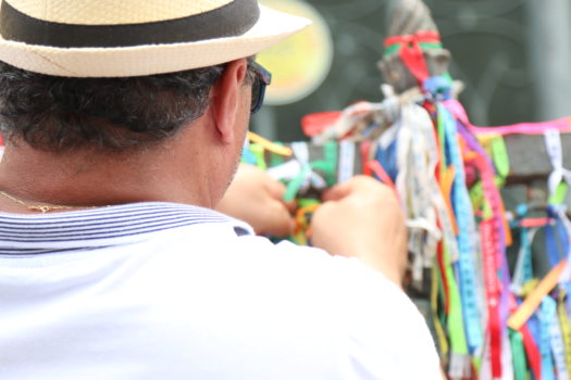 Sincretismo religioso – Ao chegar o cortejo, as baianas seguem uma tradição milenar e lavam com água de cheiro o adro da Basílica. Um pouco mais à frente, pais de santo davam banhos de pipoca e de folhas nos fiéis em frente à escadaria da Basílica. Essa é a forma de quem é do Candomblé saudar e cultuar Oxalá, agradecendo e pedindo forças.