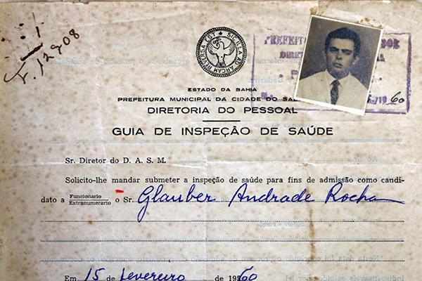 Nos arquivos do Setor de Gestão Documental, a caixa de número 345 contém um envelope com 11 documentos do conquistense. Fichas financeiras, de cadastro, de frequência, guia de inspeção de saúde, memorando e folha corrida revelam alguns dados pessoais. Glauber residia num imóvel na Rua General Labatut, nos Barris, e entrou na Prefeitura sob contrato individual de trabalho. Seus vencimentos mensais chegavam ao valor bruto de 20 mil cruzeiros – pouco mais do que o dobro do salário mínimo instituído em 1960, que era de 9,6 mil cruzeiros. Era uma quantia ínfima para quem quisesse se dar ao luxo de ter um automóvel na época. Para ser ter uma ideia, um Fusca era vendido por 540 mil cruzeiros. Outros modelos populares, como DKW Belcar custava 668 mil cruzeiros e o Willys Dauphine, 530 mil cruzeiros.