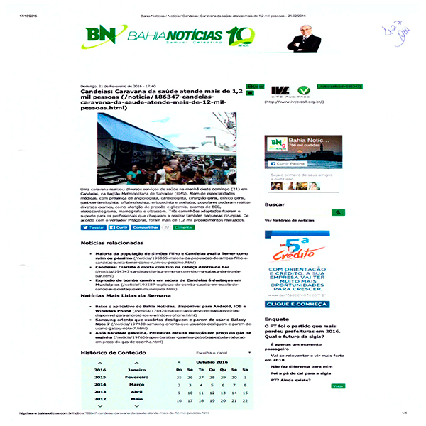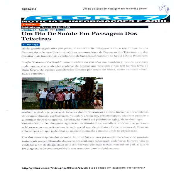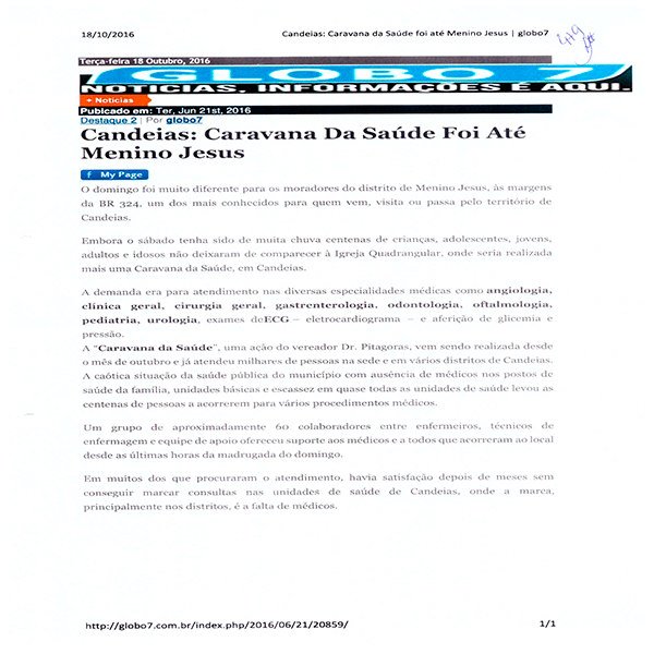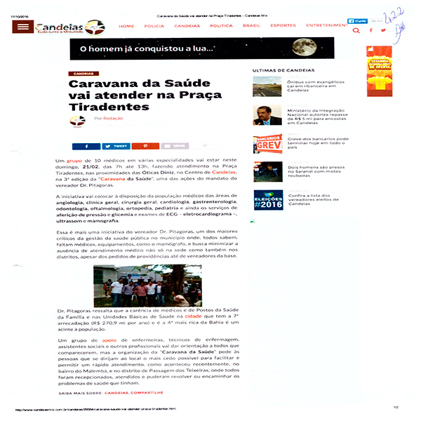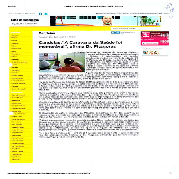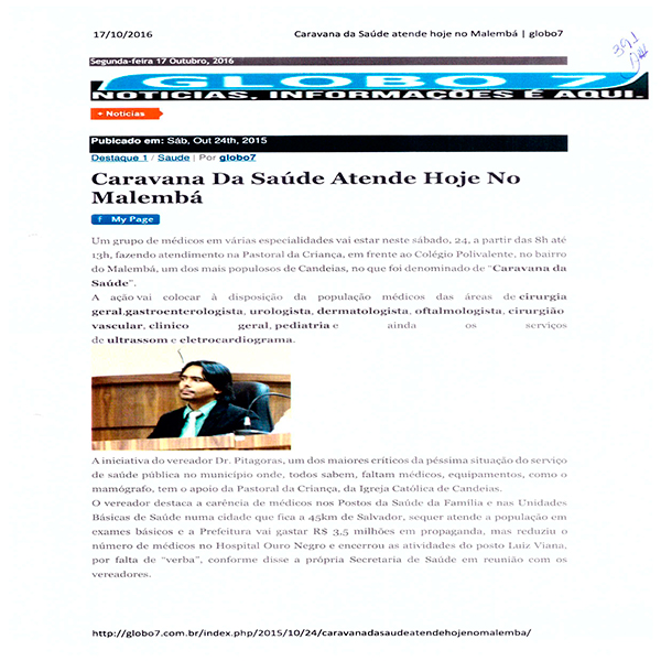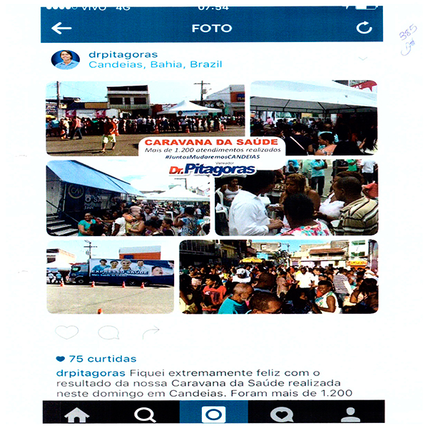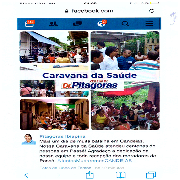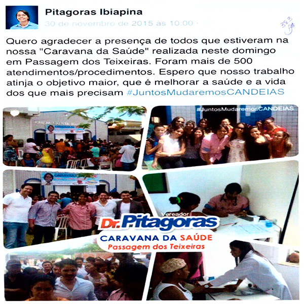 O Prefeito de Candeias, Dr. Pitágoras será julgado pelo TRE Bahia na próxima segunda feira. O Prefeito desde outubro de 2015 até 21/06/2016 realizava a “caravana Saúde” e divulgava em sua rede social. As postagens registravam a quantidade de pessoas atendidas em cada ação: Disse que atendeu mais de 1.200 no centro; 450 pessoas e 620 procedimento médicos no distrito de Malembá; 500 pessoas em passagem do Teixeira; Não indicou a quantidade de Santa Clara e Pindoba, bem como em Coroba. Conforme reportagens e postagens constantes do processo, e em anexo. A equipe médica era composta de Cirurgião Geral. Gastroenterologista, Urologista, dermatologista, oftalmologista. Cirurgião Vascular Clínico Geral Pediatra, Ultrasson e eletrocardiograma. Era um verdadeiro hospital, com caminhões, realizando consultas, exames e pequenas cirurgias.