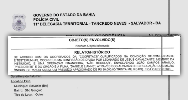 Em Salvador, a 11ª Delegacia Territorial de Tancredo Neves está investigar uma denúncia de suposto esquema criminoso com um prejuízo de quase R$ 30.000,00 mil reais à Cooperativa de Transporte Alternativo Complementar de Salvador (COOPETACS).
