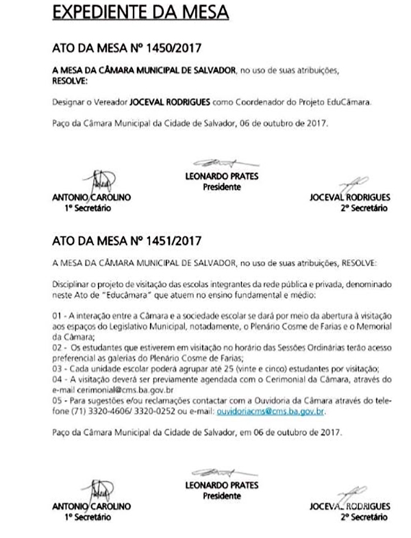 A Câmara de Salvador vai se aproximar da comunidade escolar por meio do projeto Educâmara, instituído pelo Ato nº 1451/2017, publicado no Diário Oficial do Legislativo desta segunda-feira (9). “O Educâmara está voltado ao futuro. Precisamos passar às crianças a importância do Poder Legislativo, para que se tornem adultos conscientes e participativos”, afirmou o coordenador da iniciativa, vereador Joceval Rodrigues (PPS).